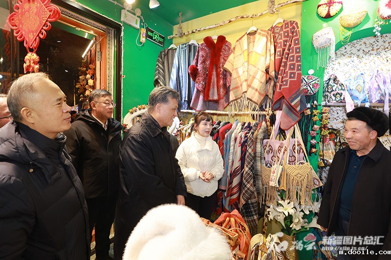 2月8日,自治区党委书记马兴瑞来到库车龟兹小巷,走进特色商铺了解商户经营情况,鼓励经营人员学好国家通用语言文字,依托旅游发展增收致富。石榴云/新疆日报记者 崔志坚摄