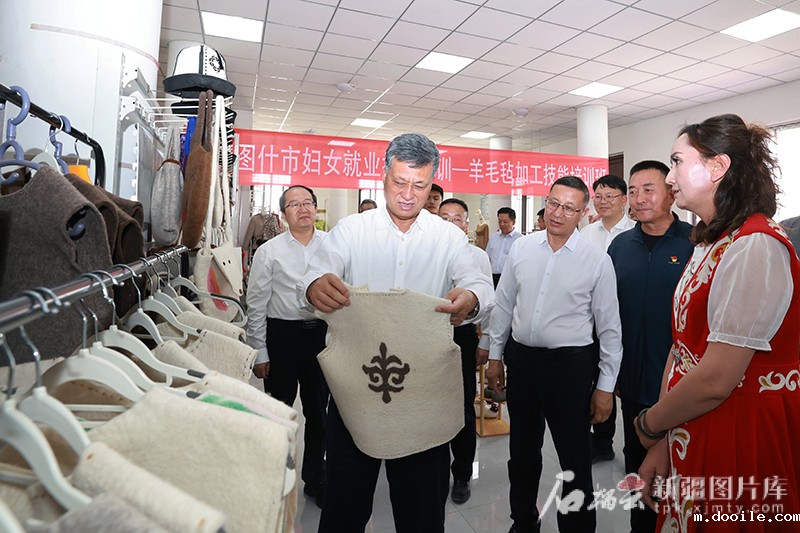 5月27日,自治区党委书记马兴瑞来到阿图什市哈拉峻乡艺彩坊手工艺品制作专业合作社,察看村民用非遗工艺制作的特色羊绒产品,详细询问村民收入情况。石榴云/新疆日报记者 崔志坚摄